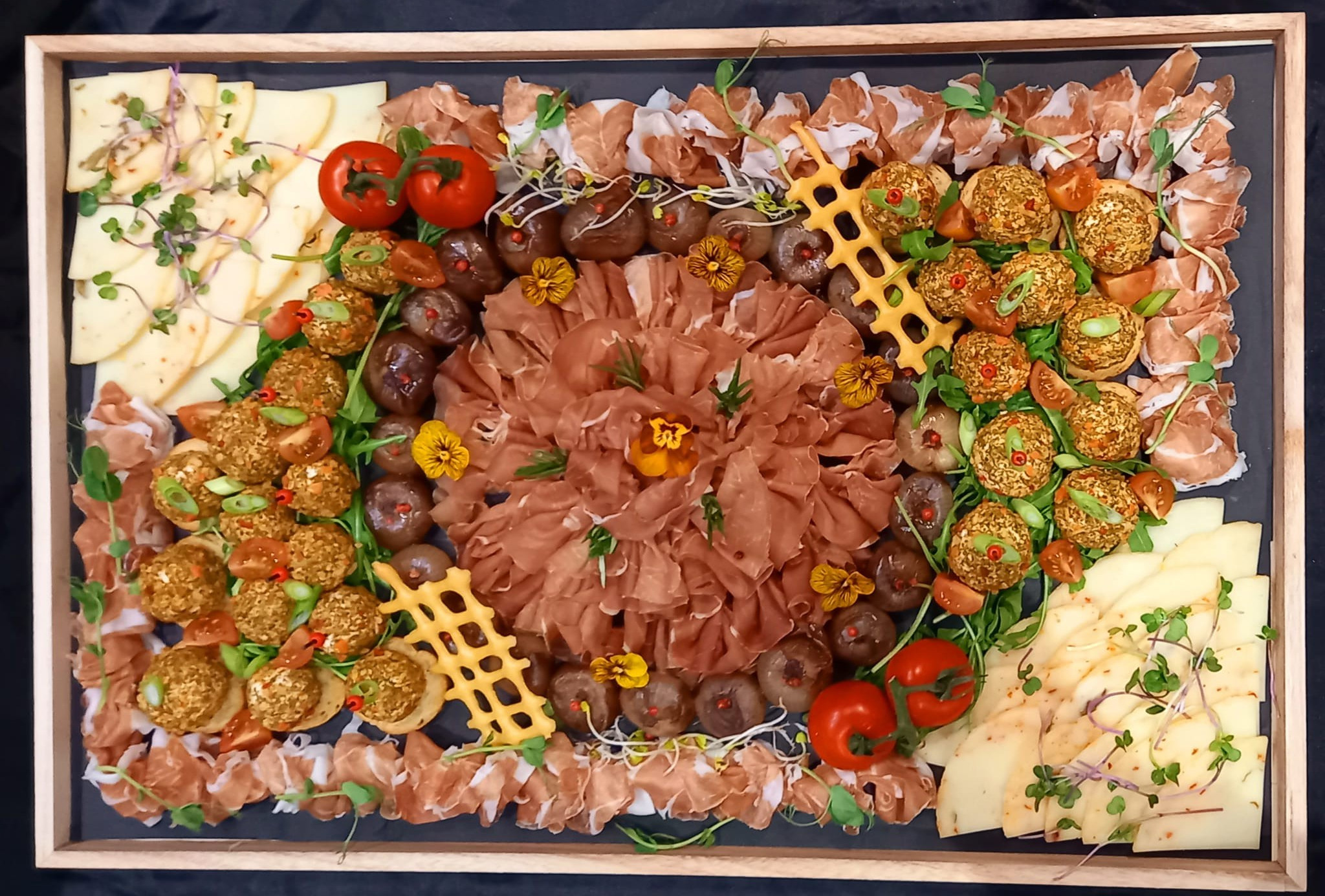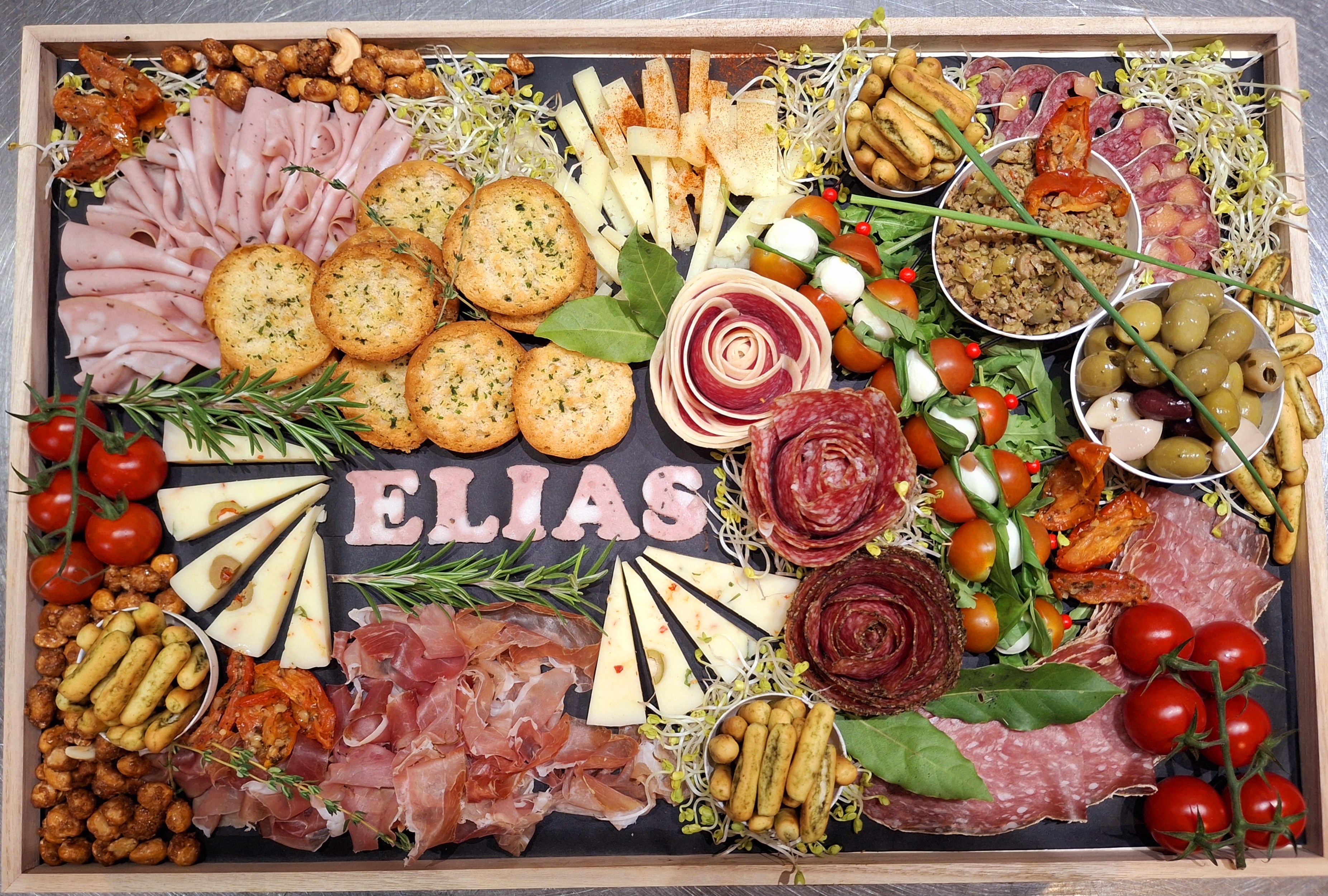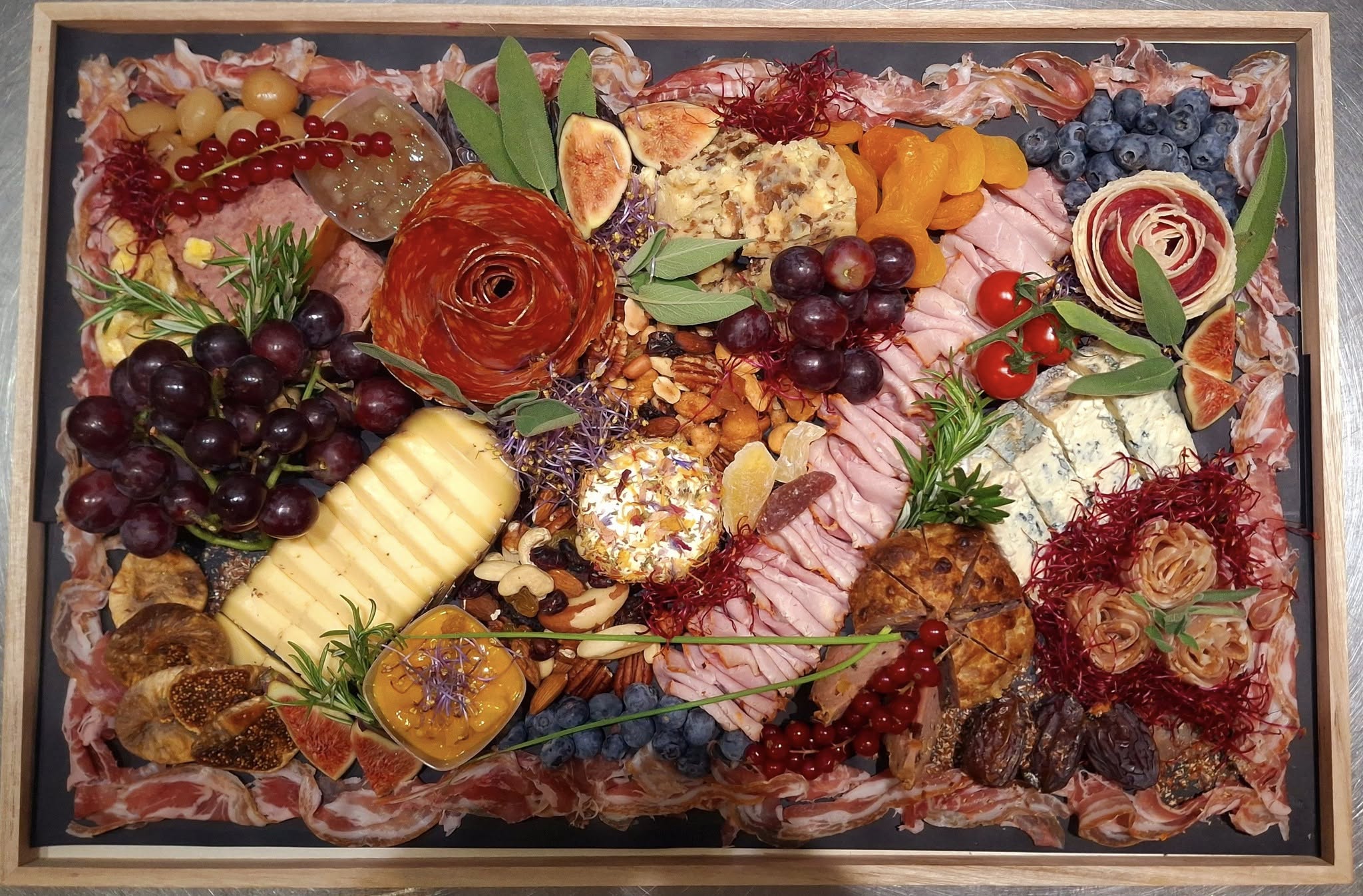 Een gevarieerde selectie van droge hammen,filets, salami, olijven, tapas, hartige koekjes met hummus of tapenade en harde kazen. Ideaal bij de aperitief maar ook als 'vervanger' van een voorgerecht uiterst geschikt.